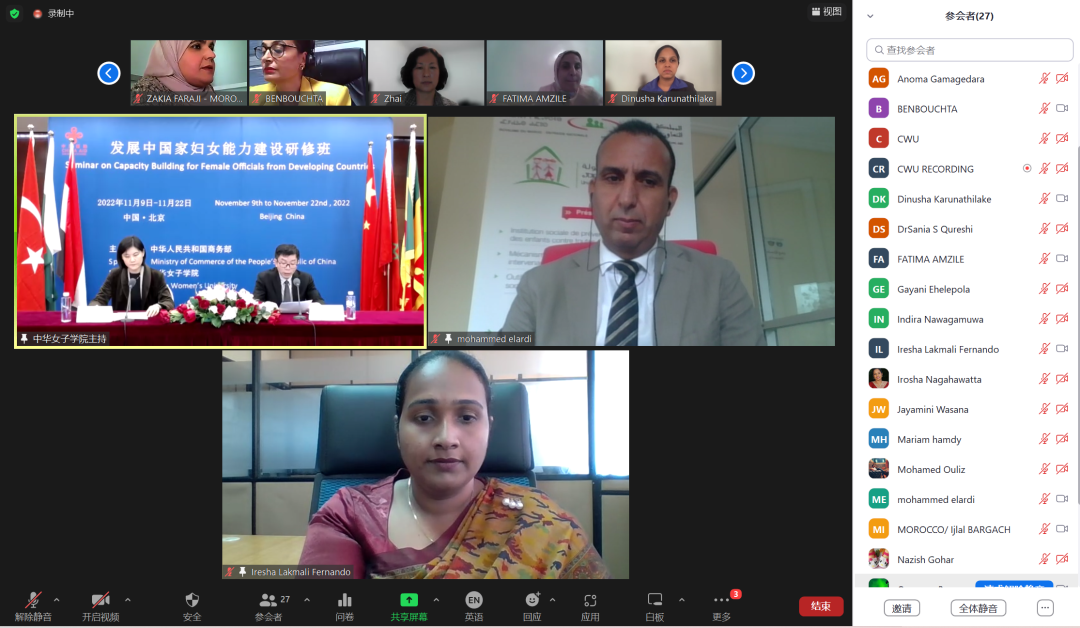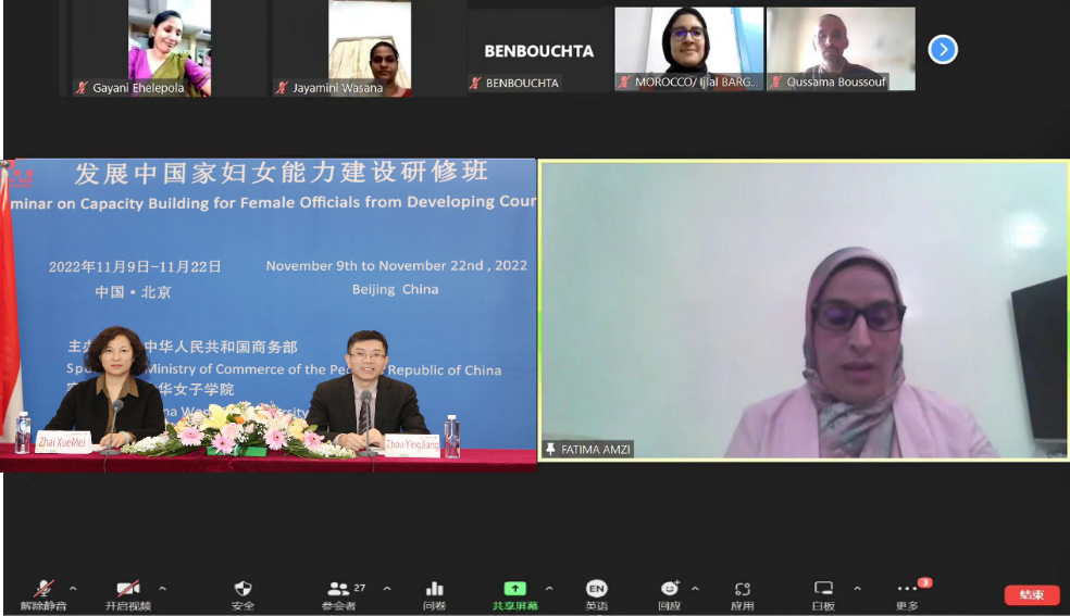 由国家商务部主办,我校承办的短期援外培训班 “发展中国家妇女能力建设研修班”(多边)于2022年11月9日至11月22日在线上成功举办,来自埃及、巴基斯坦、摩洛哥、斯里兰卡以及土耳其5个国家的51位学员报名参加培训。